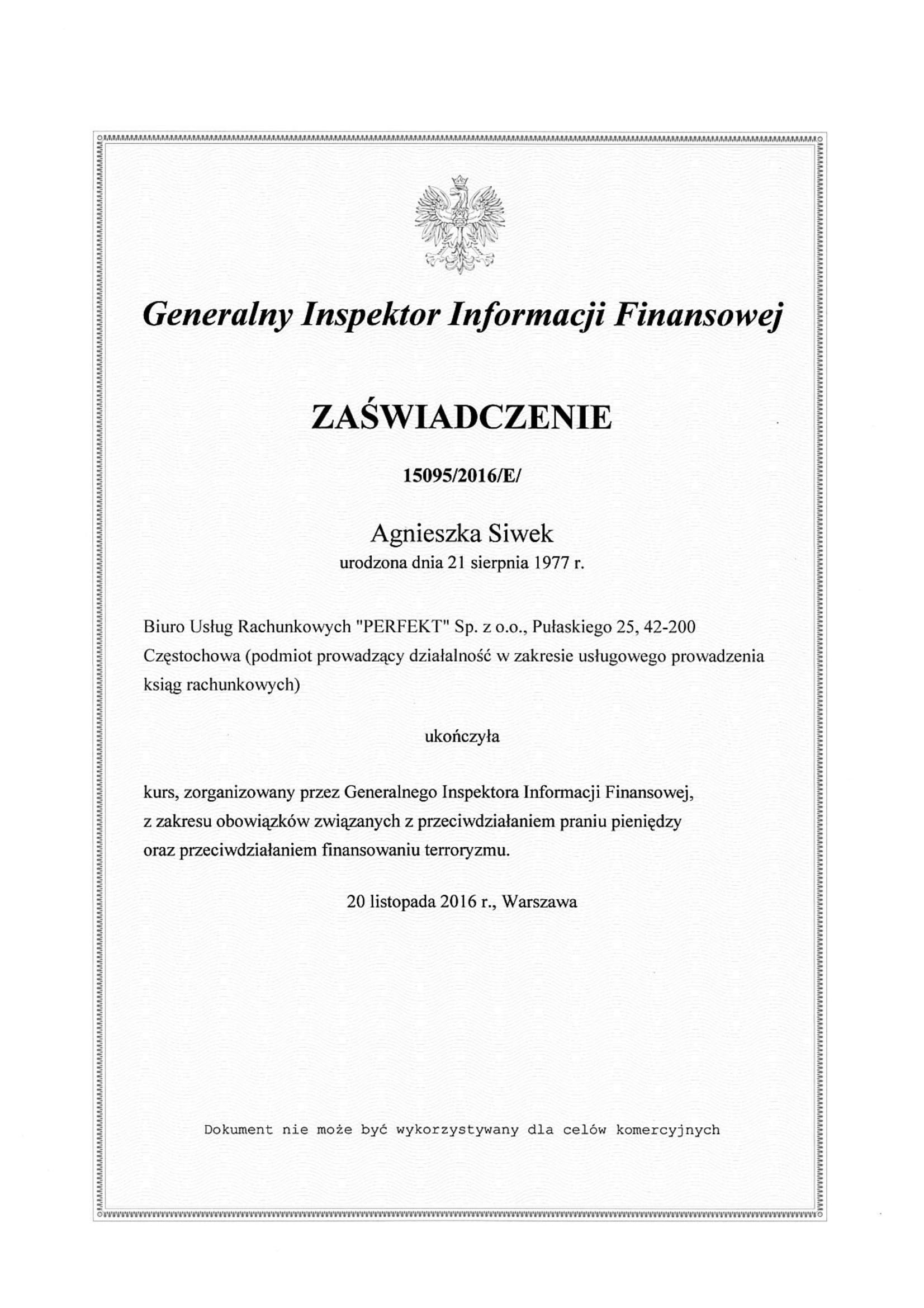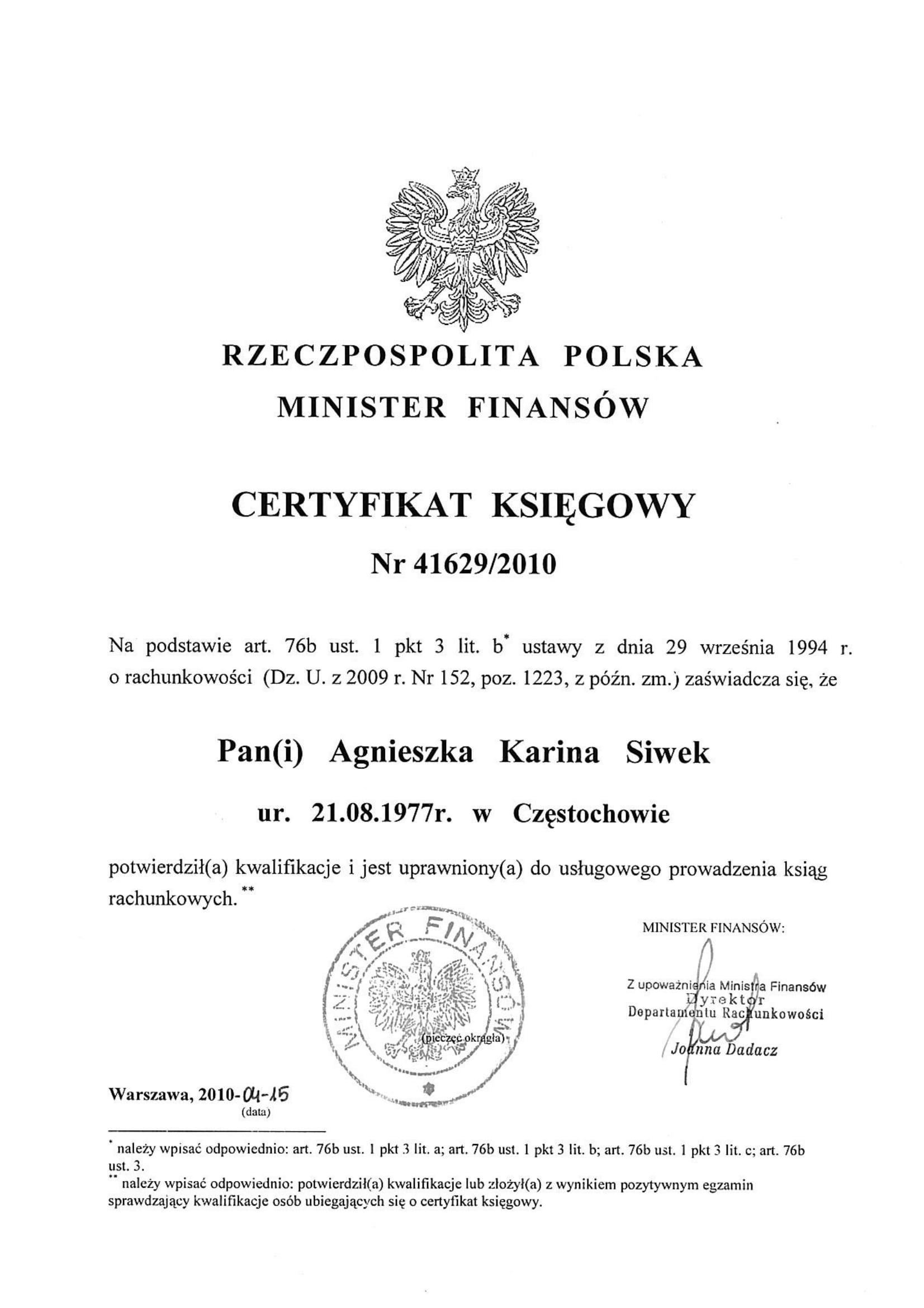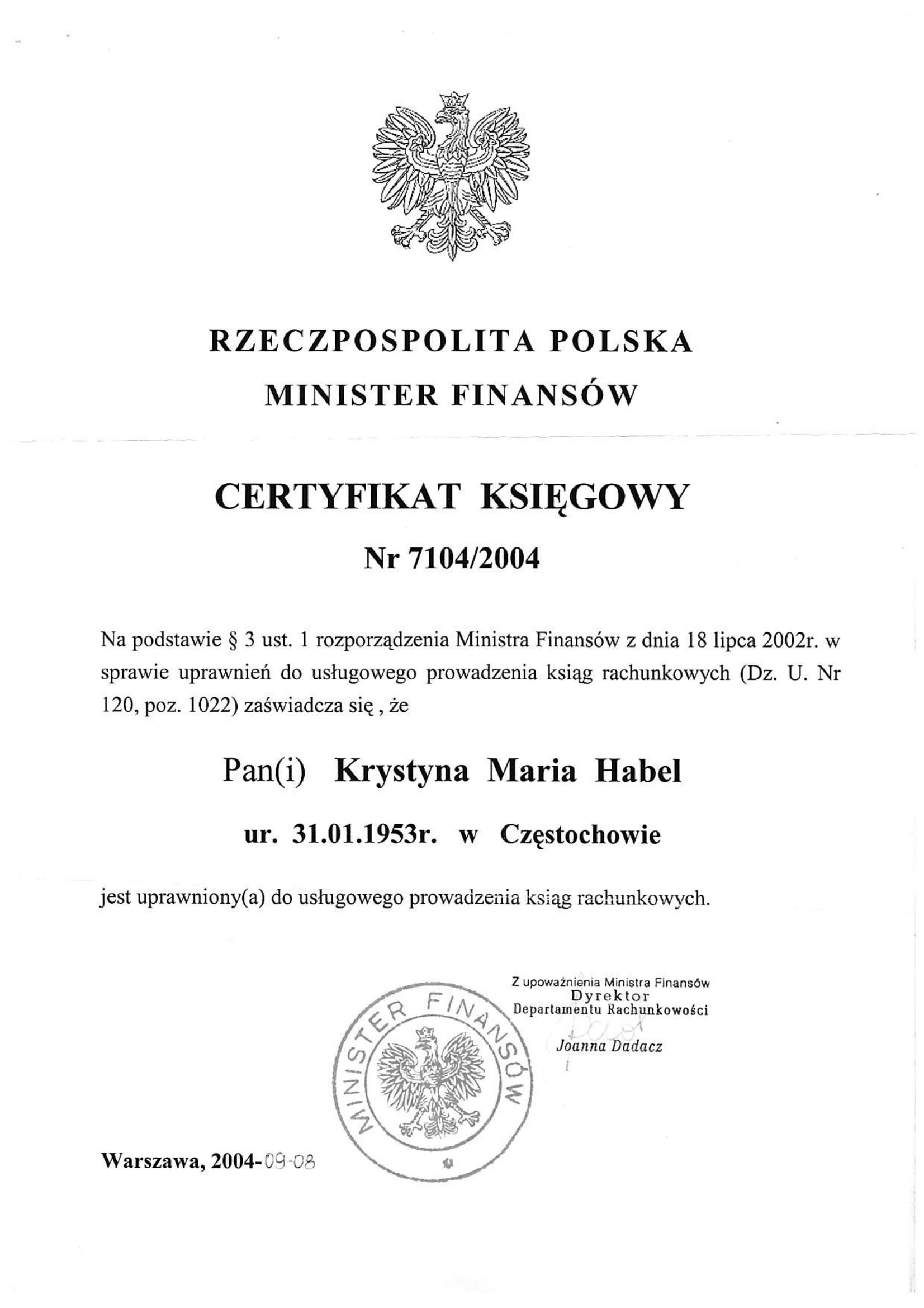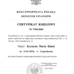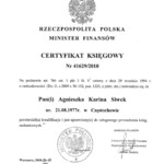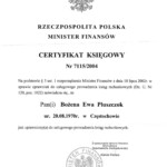 - certyfikaty księgowe wydane przez Ministerwsto Finansów 7104/2004, 7115/2004, 41629/2010